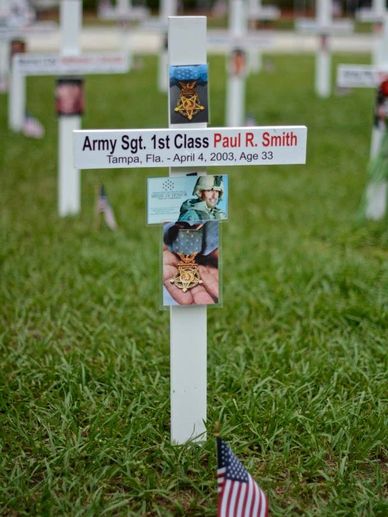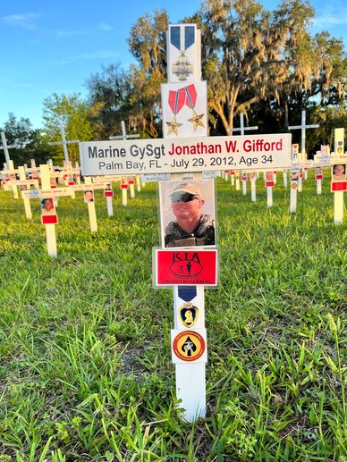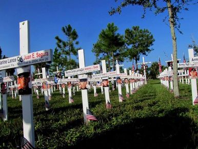 There are over 400 crosses and Stars of David, representing Floridians who have died in military service to our Country since September 11, 2001. These markers have names, military branch, rank, hometown, casualty date, age, photographs, and awards.